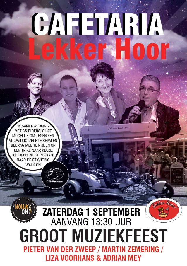 Tijdens het grote muziekfeest kun je genieten van optredens van Pieter van der Zweep, Martin Zemering, Liza Voorhans & Adrian Mey. En door de medewerking van Stichting de CS-Riders kan men, tegen een vrijwillige, zelf te bepalen, vergoeding mee rijden op een trike naar keuze. De opbrengsten hiervan komen te goede aan Stichting Walk On.